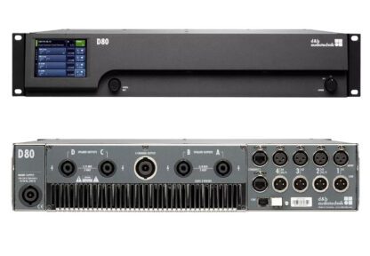 The 2 RU four channel D80 amplifier is a high power density amplifier, ideally suited for use in both mobile and installation environments. It contains configurations for all d&b loudspeakers and a linear mode. The signal delay capability enables user definable settings of up to 10 s (= 3440 m/11286 ft) to be applied independently to each channel. The same applies to the two 16-band equalizers, providing optional parametric, asymmetric, shelving or notch filtering. The D80 incorporates a colour TFT touchscreen, offering quick access to the menu structure, while the rotary encoder can be used for fine adjustment. The front panel and the integrated touchscreen of the D80 amplifier is tilted up for ease of operation when the amplifier is below eye level. The equal ratio of signal input to amplifier output channels increases the application flexibility particularly for monitor, frontfill or effect channel use. The LoadMatch function integrated within the D80 amplifier enables the electrical compensation of loudspeaker cable properties, without the need for an extra conductor. This results in an increased accuracy of audio reproduction over a bandwidth of up to 20 kHz, preserving the tonal balance when cable lengths of up to 70 m (230 ft) are used. The D80 incorporates Class D amplifiers utilizing a power supply with active Power Factor Correction (PFC) suitable for mains voltages 100 V/120 V/200 V/230 V, 50 – 60 Hz and maintains a stable output when used with weak or unstable mains supplies. The D80 amplifier outputs are NL4 connectors plus one centered NL8 connector with all pins driven. RJ 45 and etherCON connectors enable access to the d&b Remote network via CAN-Bus and OCA/AES70 via Ethernet respectively. For further information regarding the integration of additional functions into the D80, please contact your Distributor.